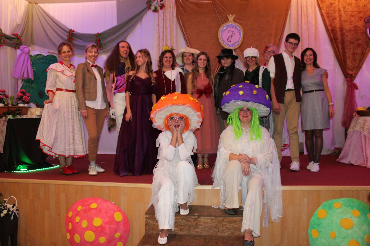 Trénovalo se pod vedením paní režisérky Ivy Šedové. Hlavní hrdinové byli žáci 9. třídy: Zoe Dragounová v roli princezny Jiřinky a Jan Foriška v roli Blažeje. Scénář měl vtipné dialogy a v podání našich herců se publikum mnohokrát zasmálo. Čarodějné houby Pindruše svými rozpustilými kousky vyloudily úsměv na tvářích všem lidem. Několikrát se během představení na pódiu objevily děti z 2. až 6. tříd s nacvičeným tanečkem. Krásně to doplnilo slavnostní atmosféru zámeckých komnat, kde se děj pohádky především odehrával. Také taneční číslo lesních houbiček mělo u diváků velký úspěch.