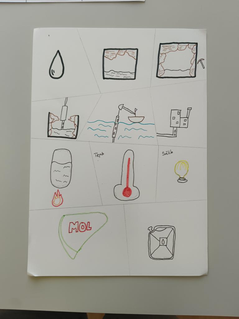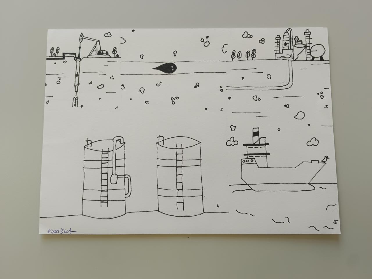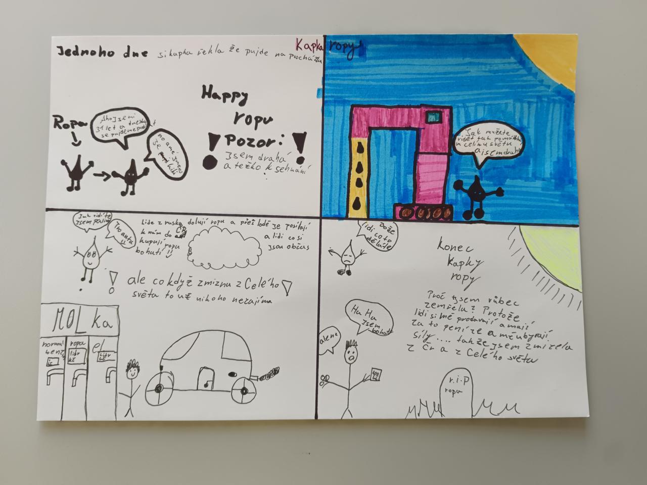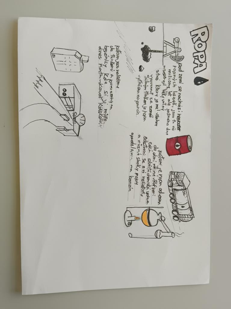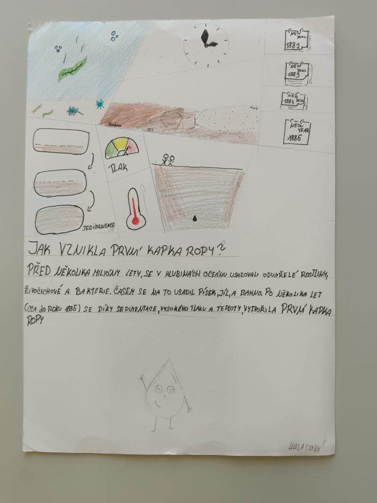 Jaká je cesta kapky ropy od jejího vzniku až ke konečným výrobkům? To bylo téma chemie v tomto týdnu. Nejprve jsme se podrobněji seznámili s tím, jak ropa vznikala, poznali jsme její vlastnosti, těžbu, způsob dopravy a zpracování. Celé naše úsilí jsme zakončili projektem, ve kterém jsme samostatně zpracovali příběh jedné kapky ropy. Každý z nás pojal své vypravování o kapce trochu jinak, někdo se podíval na vznik ropy v dávných dobách, další zase své povídání začal u vytěžení kapky ropy z podzemí.