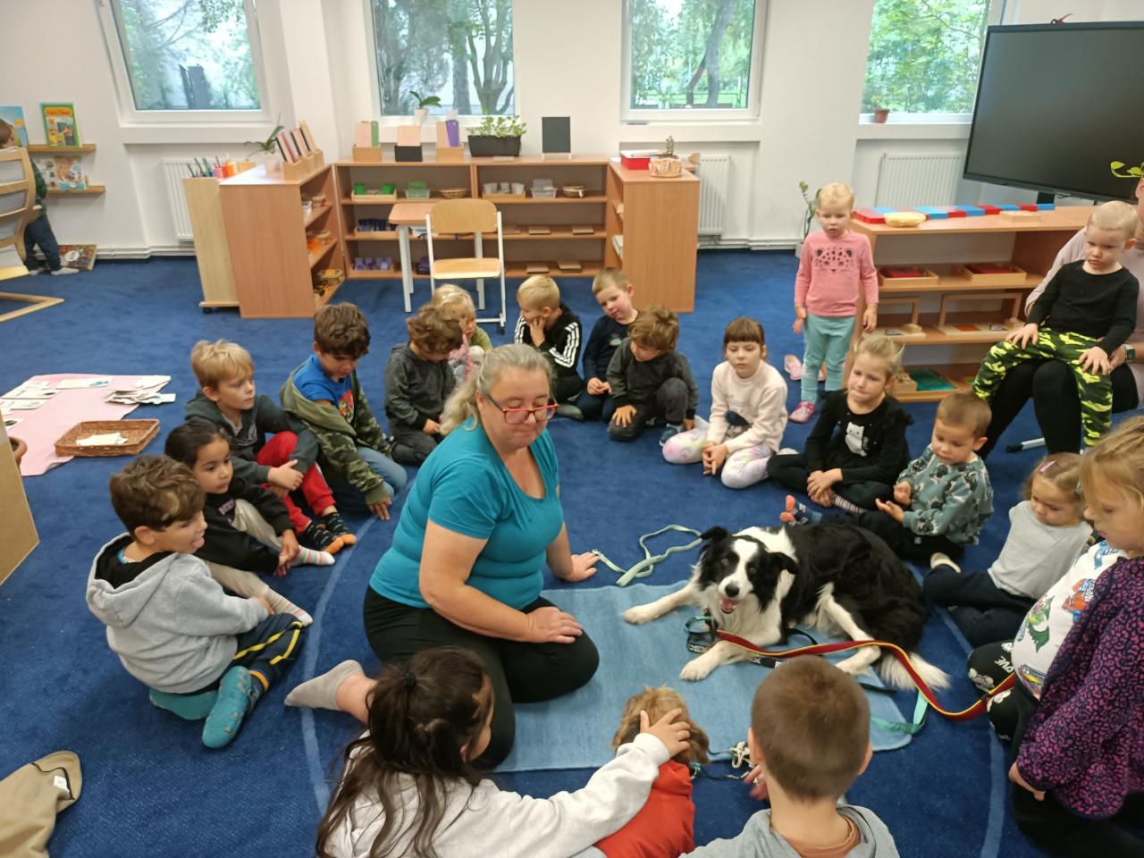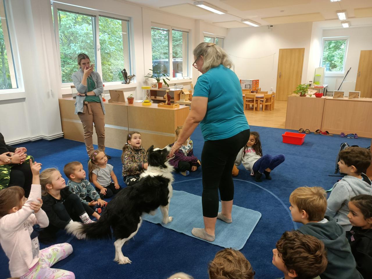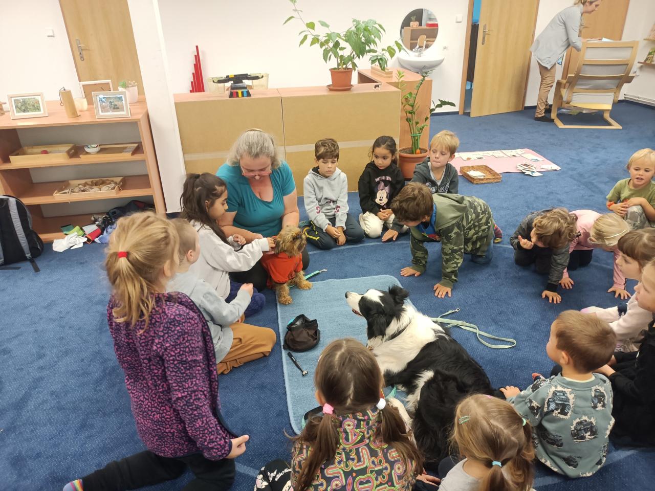 Ve čtvrtek 3. října se děti z 1. třídy montessori vypravily do školky, kde na ně a na jejich malé školkové kamarády čekala dobrovolnice paní Zdena Havlínová, která se svými děma psy jezdí nejen mezi děti do mateřských škol, ale například i do domovů pro seniory. Ukázala dětem