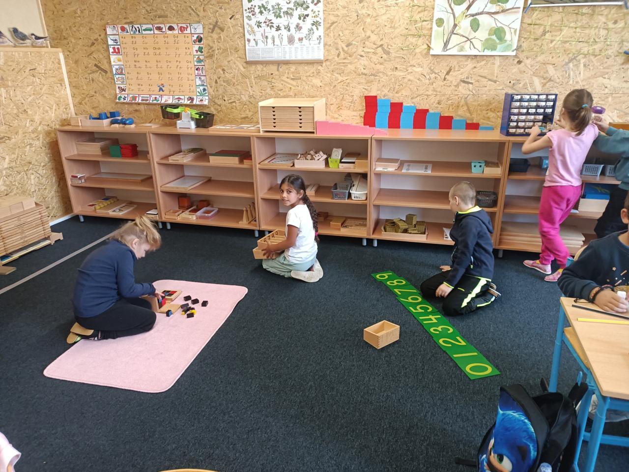 Od letošního září se začala nově na naší škole v rámci 1. třídy učit montessori skupina. Schází se v krásných nových prostorách, které vznikly v areálu školy přes letní prázdniny. Děti tu mají různé pomůcky na výuku, především smyslové, matematické, jazykové, ale například i pomůcky na výuku kosmické výchovy, která je součástí prvouky.