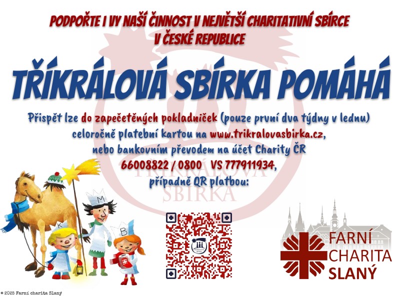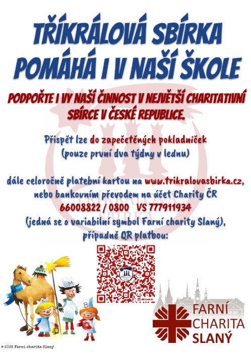 V úterý 7. ledna budou zástupci žáků obcházet jednotlivé třídy se zapečetěnou kasičkou, do které bude možné přispět jakoukoli částkou. Každá částka pomůže. Dále budou zástupci žáků obcházet městys Zlonice. Poté bude možné do kasičky přispět na recepci naší školy a to až do 14. ledna. Učme děti solidaritě a vzájemné pomoci. Věřím, že se nám společně podaří kasičku naplnit a tím pomoci lidem, kteří to potřebují.